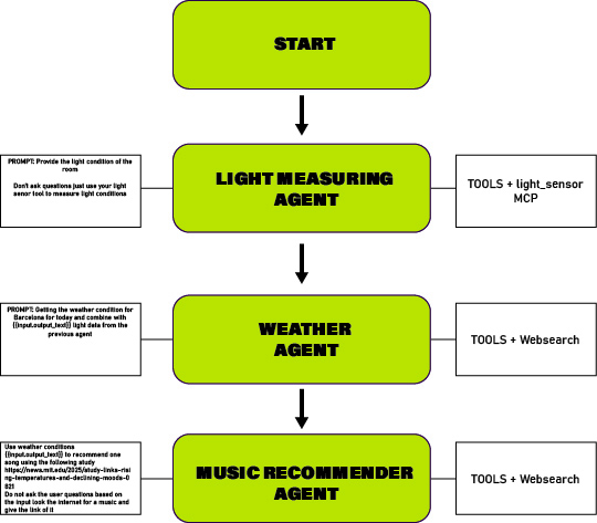 The first was a light measuring agent connected to the LDR through MCP. It was prompted to provide the light condition of the room. The second was a weather agent which used the web search tool to retrieve the current weather conditions in Barcelona. This data was combined with the light data from the previous agent. The third was a music recommendation agent. It used both the weather and light information to suggest a song. The agent referenced an MIT study linking temperature changes to mood and selected a track that could act as a mood stabilizer. When the system ran it first detected the light level in the room. It then combined that information with real time weather data from Barcelona. The final output was a song recommendation intended to stabilize mood in relation to the surrounding environment.
