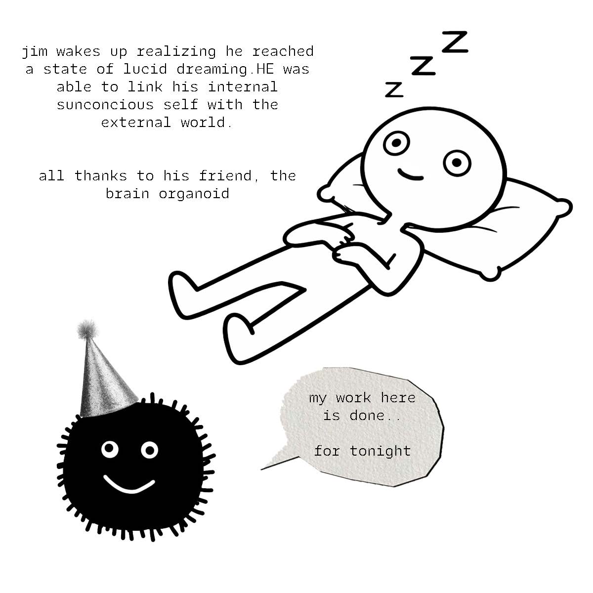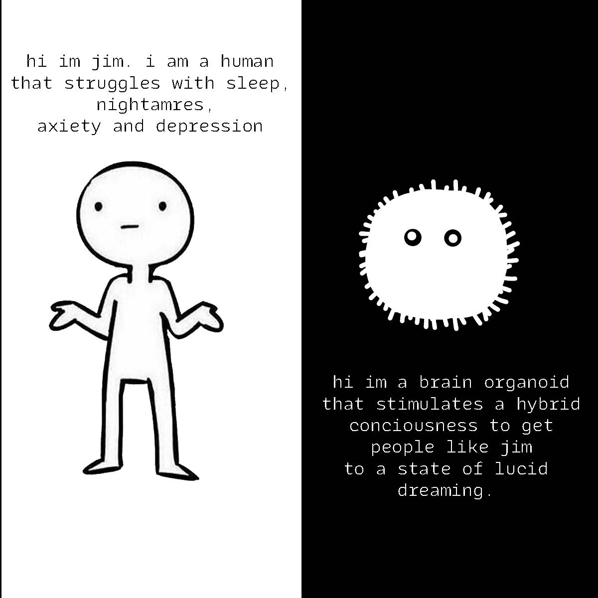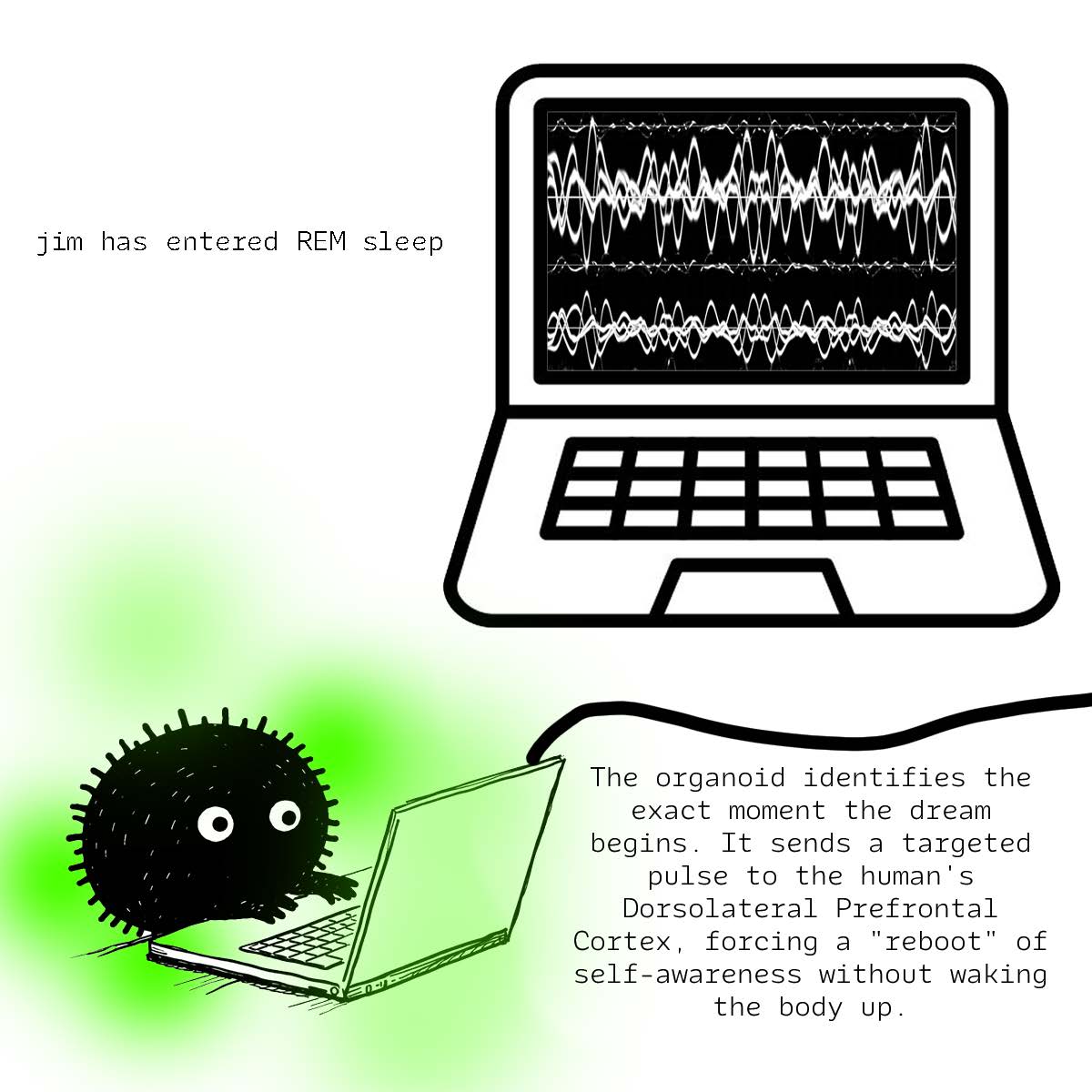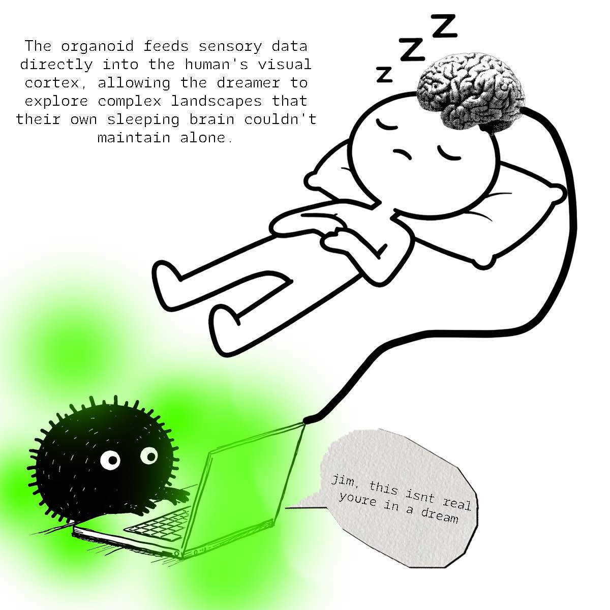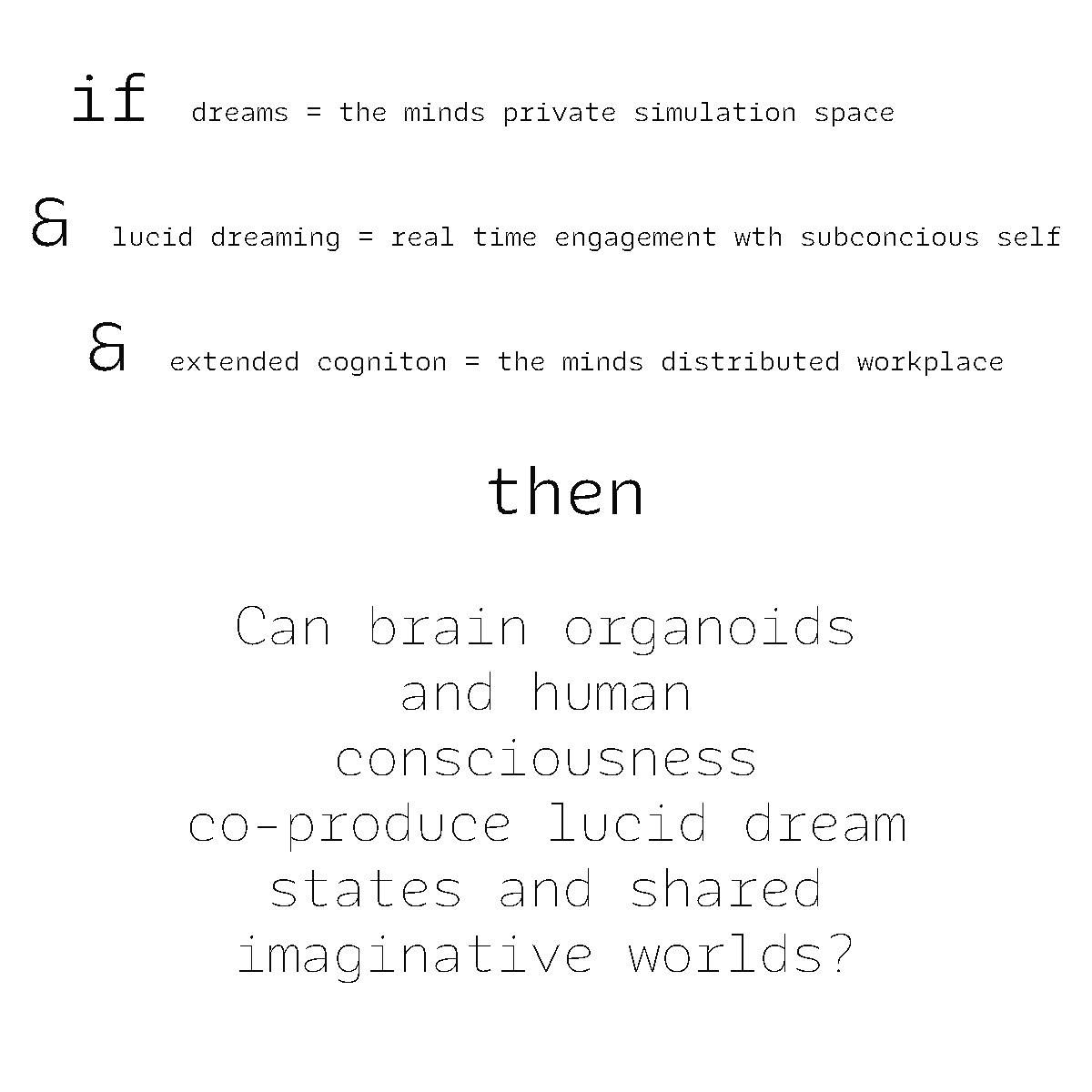 In order to exteneralize the dreamscape and create a feeling of sharing your cognition with a system that can learn and adapt to your presents and outputs, I proposed a brain organoid that would will bring a person to a state of REM sleep where they lucid dream.